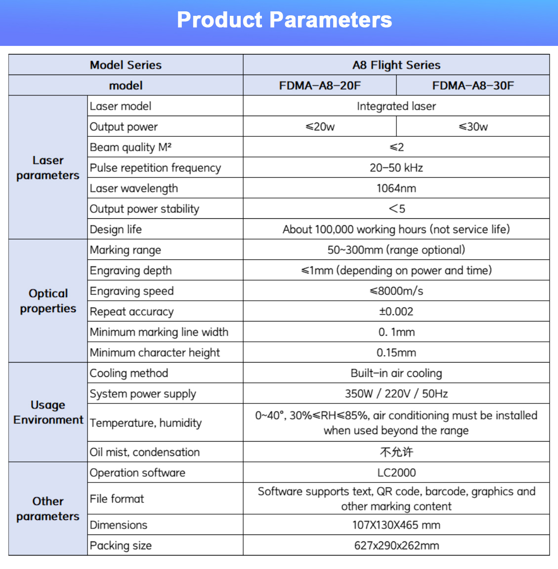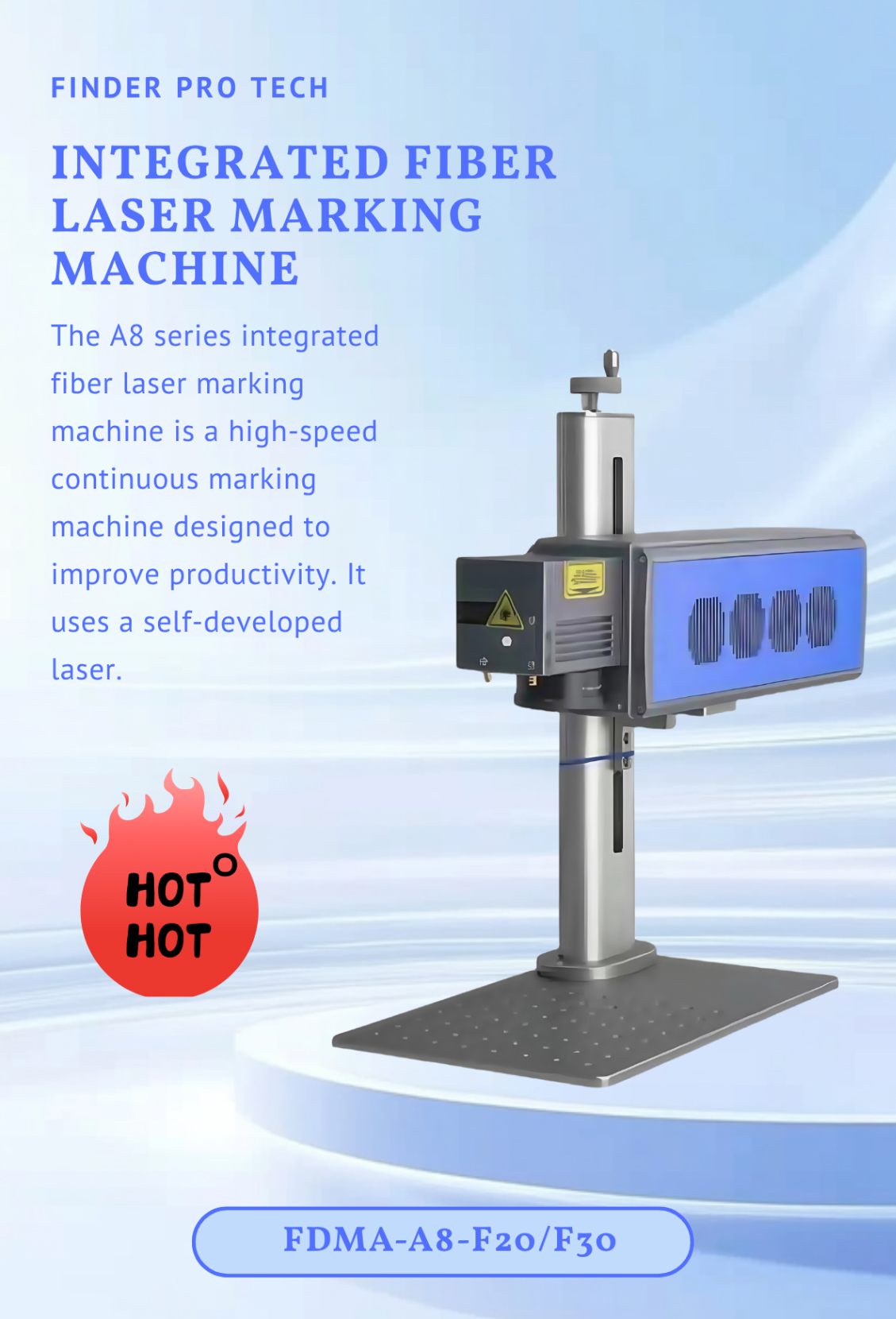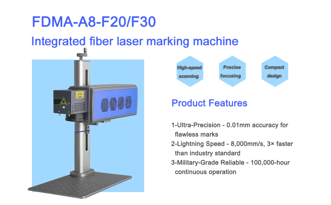 The FDMA-A8 series (20W/30W) delivers 8,000mm/s ultra-fast marking for high-volume production lines. Engineered for pharmaceutical, food packaging, and anti-counterfeiting applications, this CE-certified system combines self-developed laser technology with unmatched efficiency.
