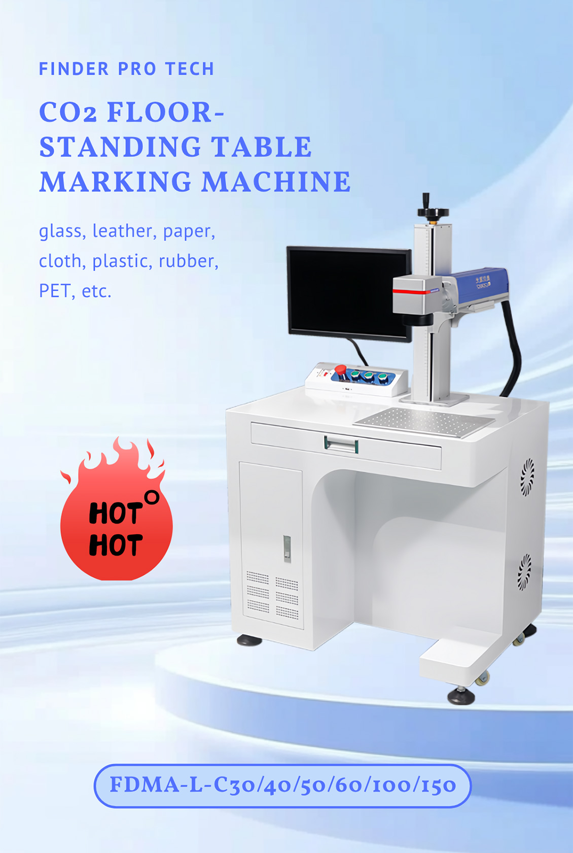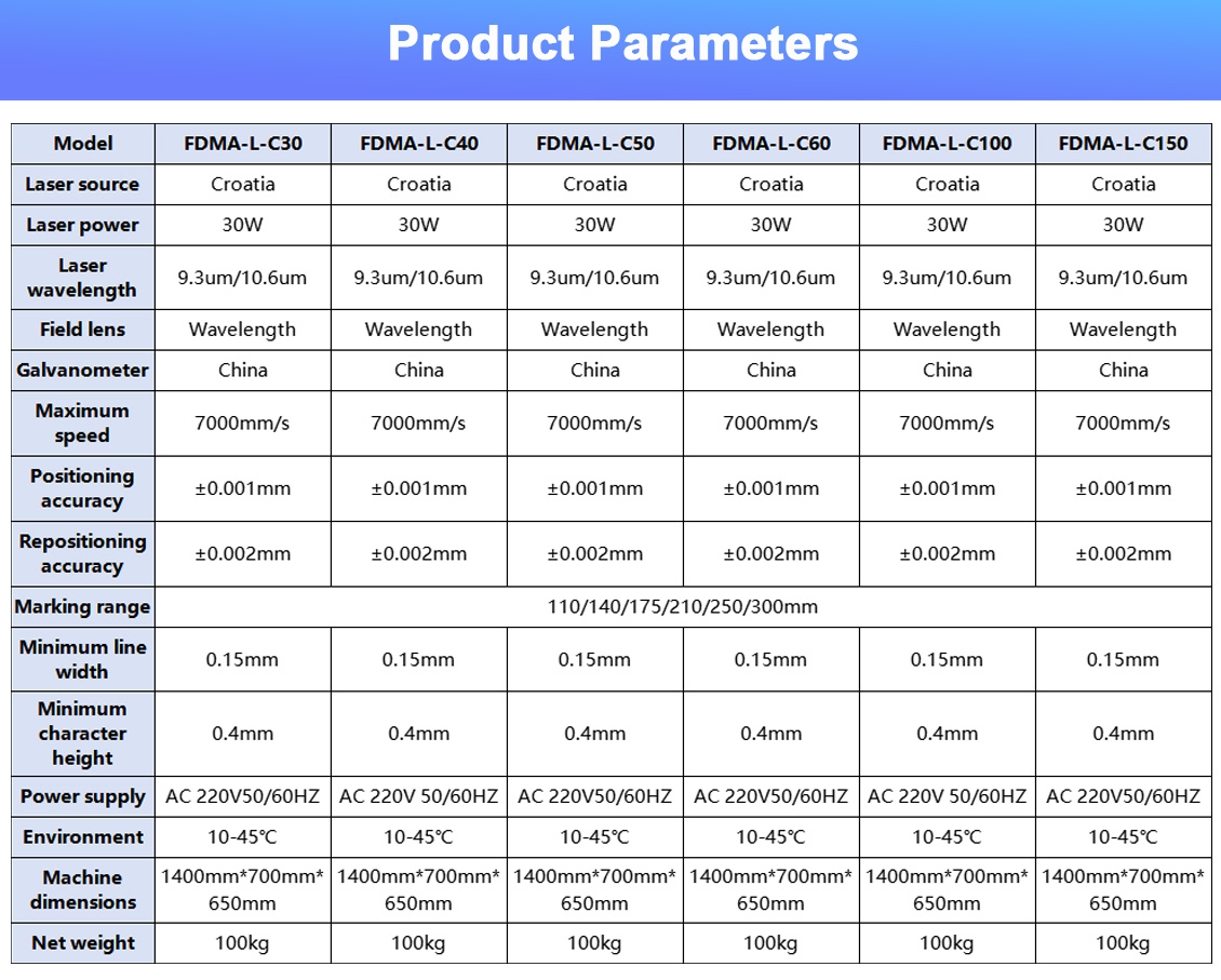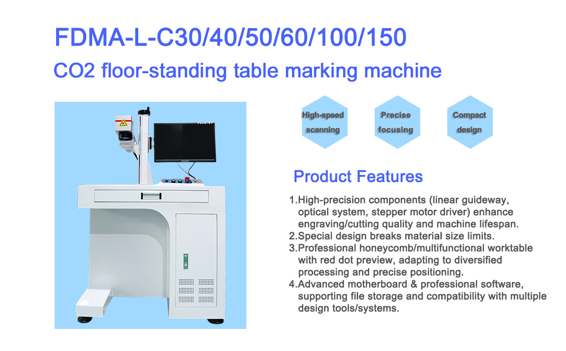 The FDMA-L-C Series (C30/C40/C50/C60/C100/C150) is a high-performance CO2 floor-standing laser marking machine designed for glass, leather, paper, fabric, plastic, rubber, PET and other non-metallic materials. With software-controlled power adjustment and no consumables required, this industrial-grade marking solution delivers exceptional precision, efficiency and cost-effectiveness for various industries.